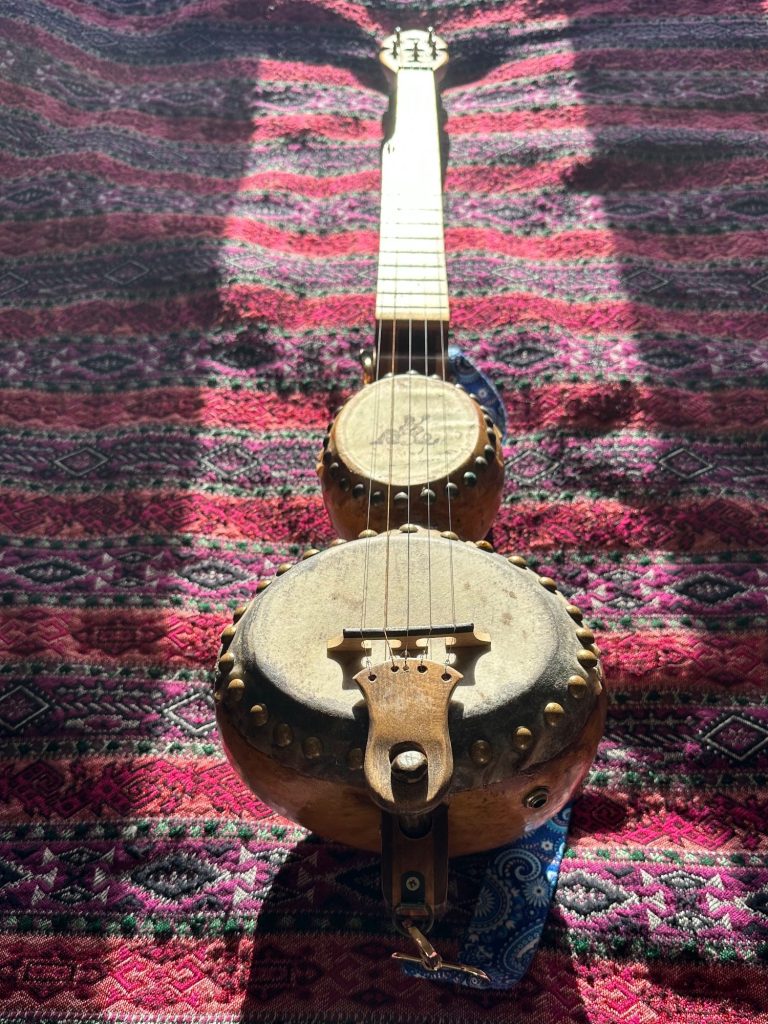 Designed and built by innovative luthier Ray White, a steel stringed Bottle Gourd banjo with a tunnelled 5th string.