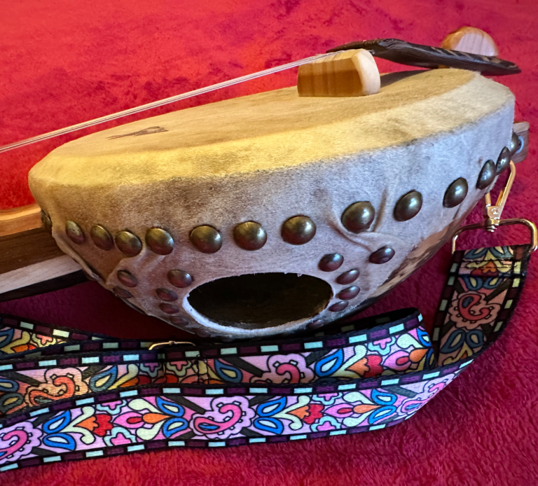 Bottle Gourd body with a 5.5 x 4 inch and a 3.5 x 3 calf skin head. 4 vertical x 6 horizontal ‘pick and mix’ wood laminate 26.25 scale length neck. Steel stringed with a maple/ebony bridge. 7.2 lb / 3.3kg in weight.