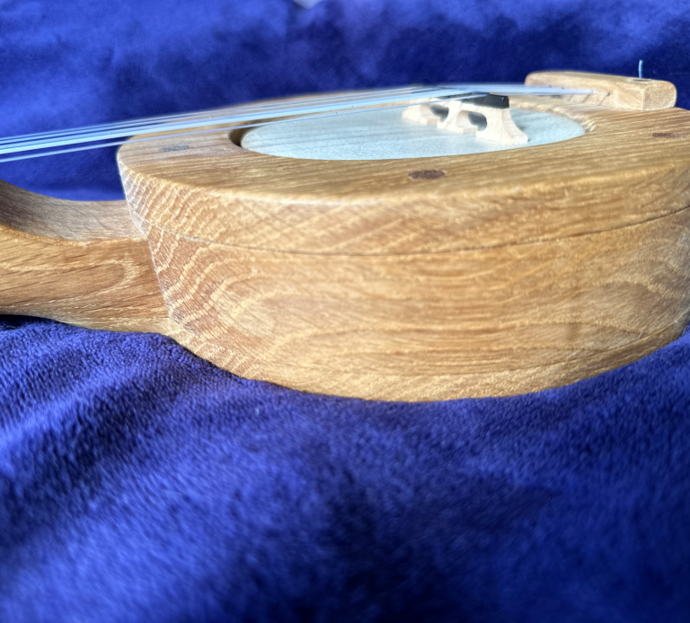 7.5 x 2.25 inch oak pot, 4.5 inch skin head, integral oak tone ring, oak neck, oak fretboard, Slim Jim moon mahogany/ebony bridge, nylgut strings. The banjo weight is 3.1 lb / 1.4 kg and the scale length is 25.5 inch.